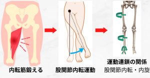 O脚改善で内転筋を鍛えるのは必要ですが、単純に脚を閉じるだけではダメな理由としては、内転運動単体では運動連鎖の関係で内転させると内旋するという特徴があるため、内旋型O脚の改善には内転筋だけでは効果が低いということになります。股関節が内旋変位しているといくら内転筋を鍛えたとしても改善しません。